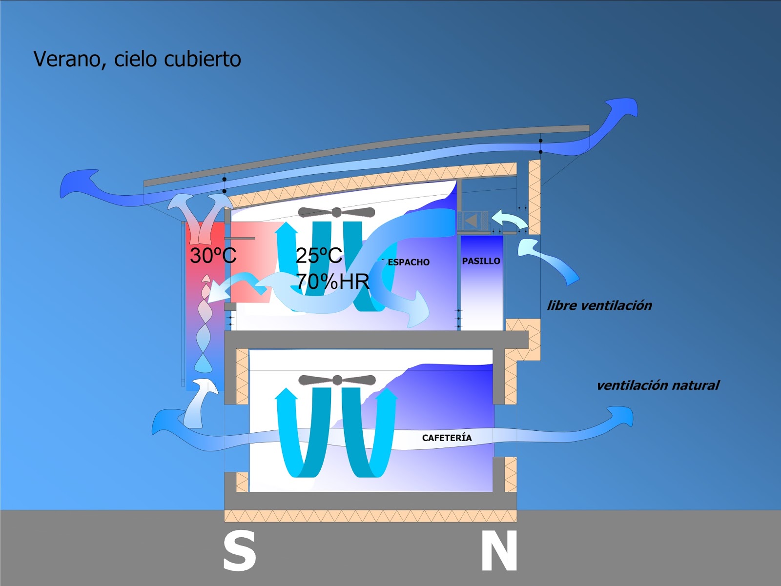 El frente S contiene tres tipos de componentes bioclimáticos con efecto
